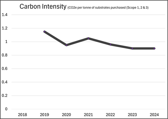 Our carbon intensity - measured as tonnes of CO₂e per tonne of substrate purchased - has shown steady progress since 2018.