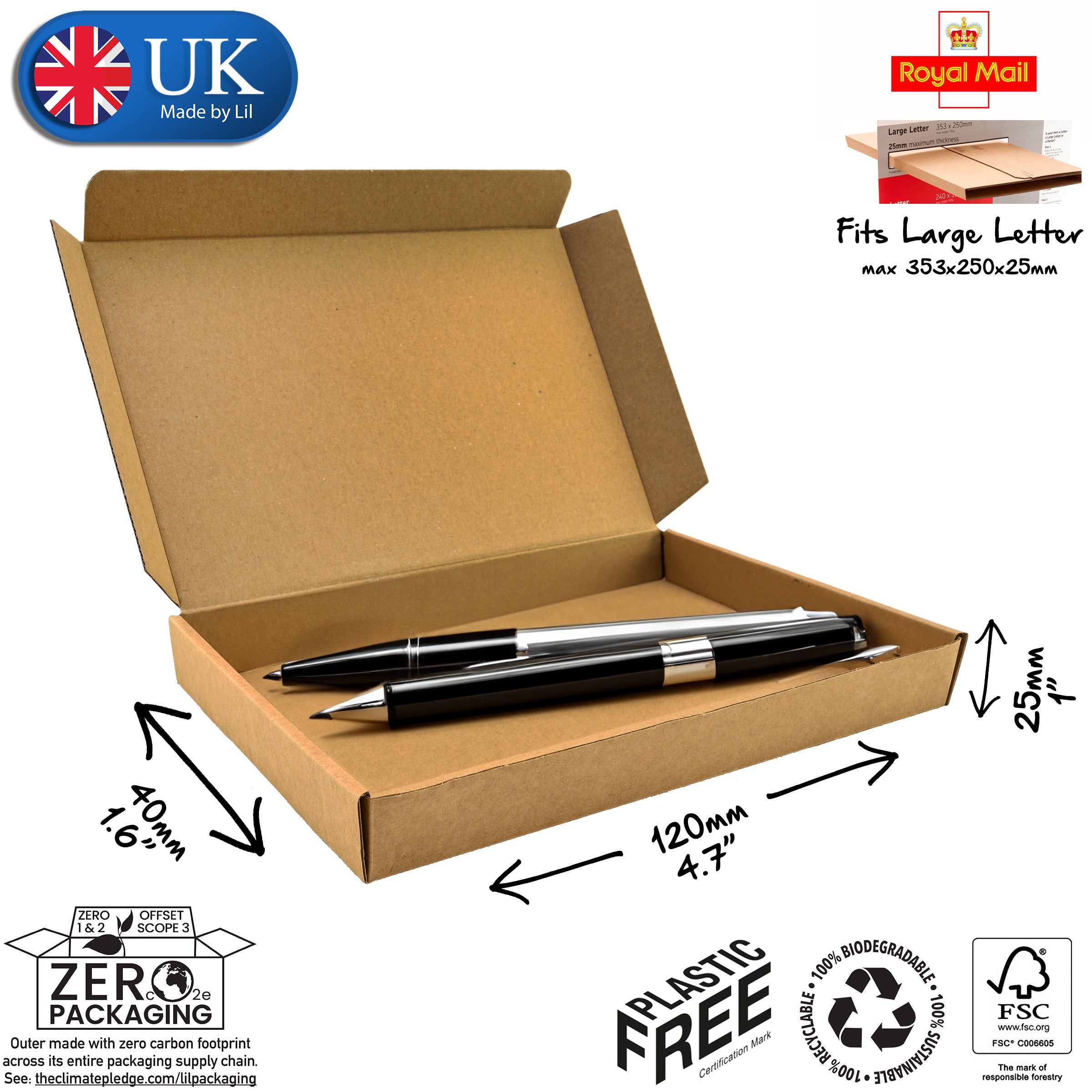 Order your 12x4x2.5cm Cardboard Postal Box today and give your pens the protection they deserve. Experience the quality and reliability of Lil Packaging, your trusted packaging partner.