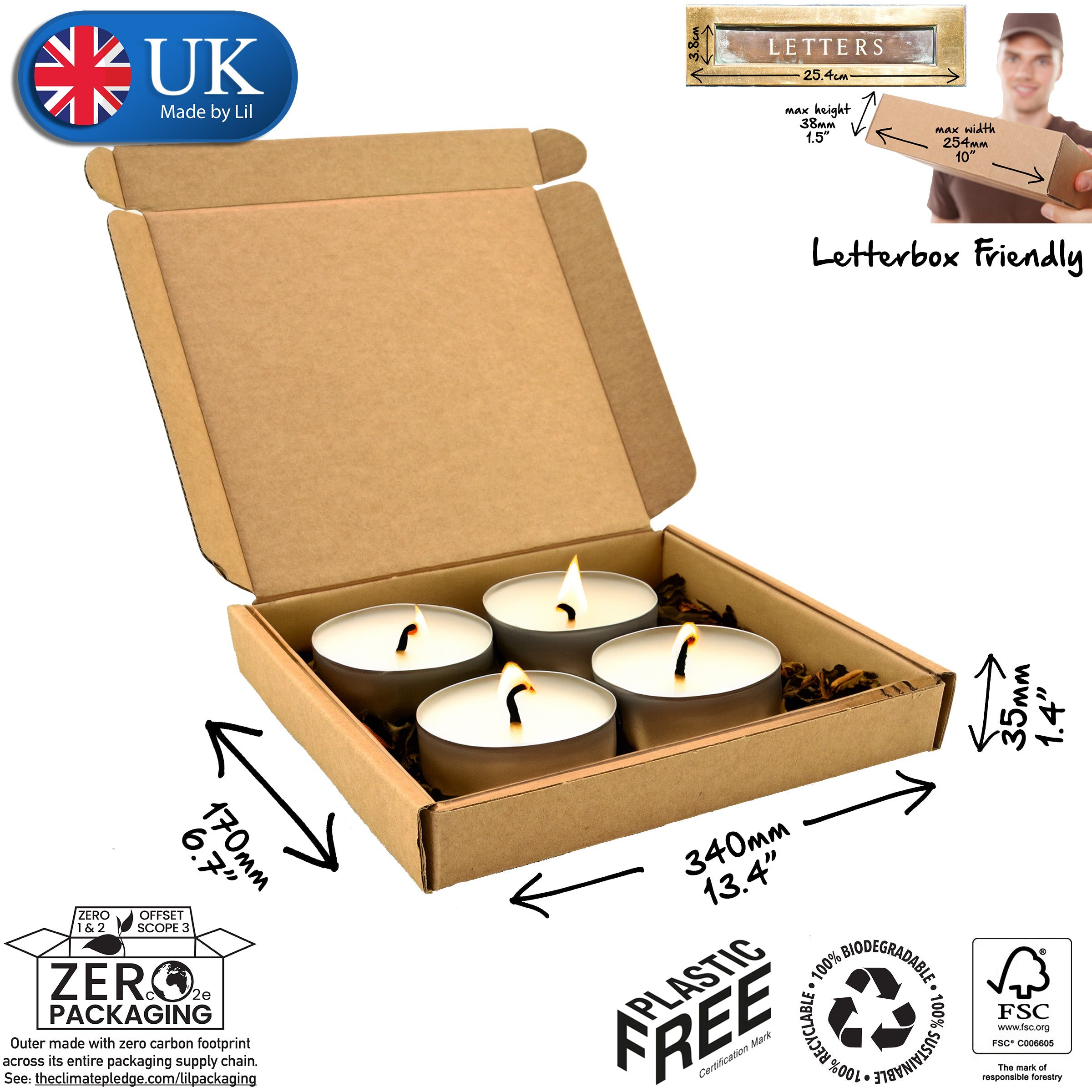 Discover the efficiency of the 34x17x3.5 Cardboard Postal Box from Lil Packaging. This compact and sturdy box is perfect for securely mailing a range of small to medium-sized items, including model car toys and a set of tea-light candles.